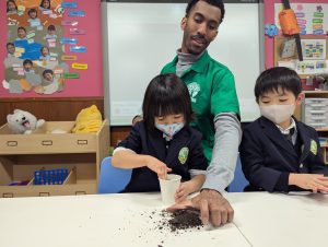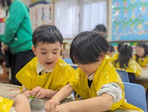 また、ただ溶かすだけでなく、“Where should we pour to get it out faster?” と考えたり、お友だちのやり方を見て真似してみたりする姿もありました。自然と協力し合い、学び合う姿もとても印象的でした。