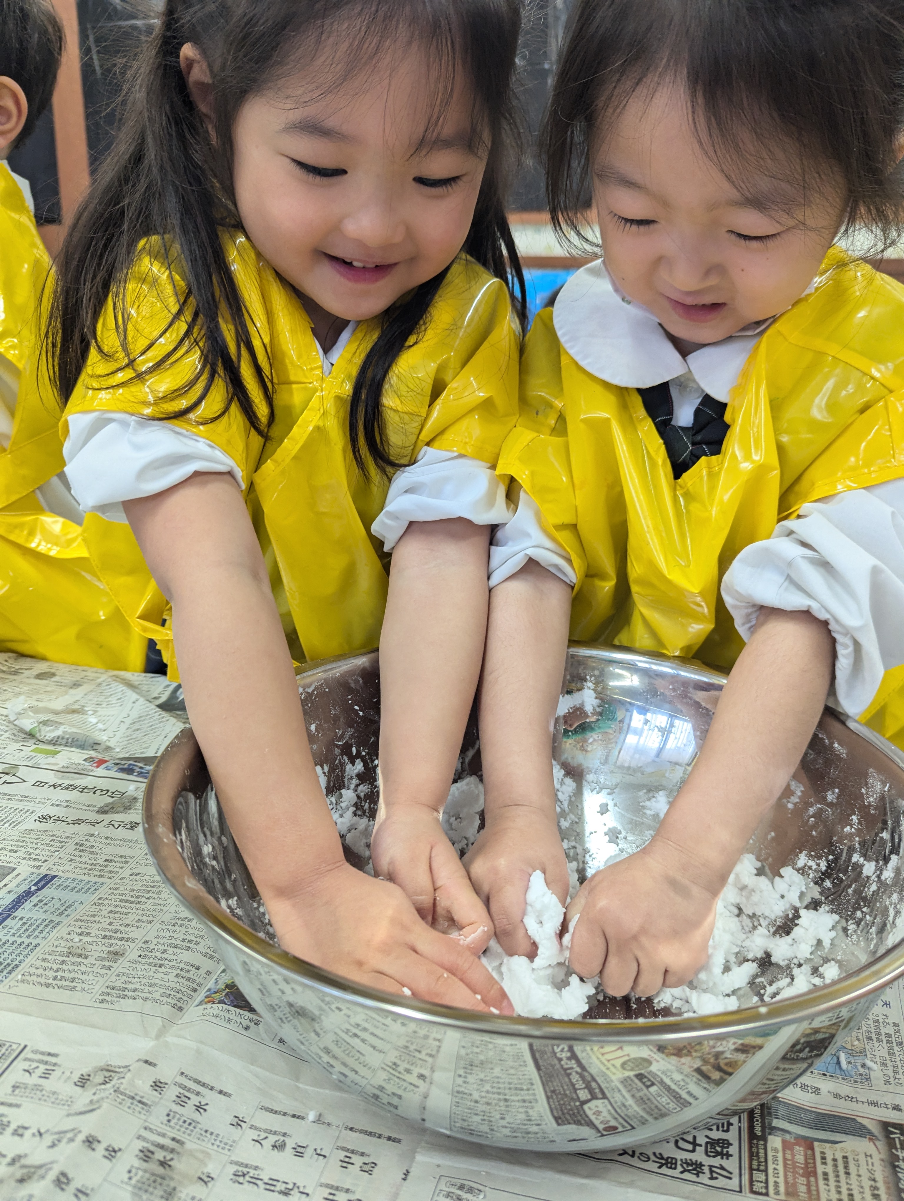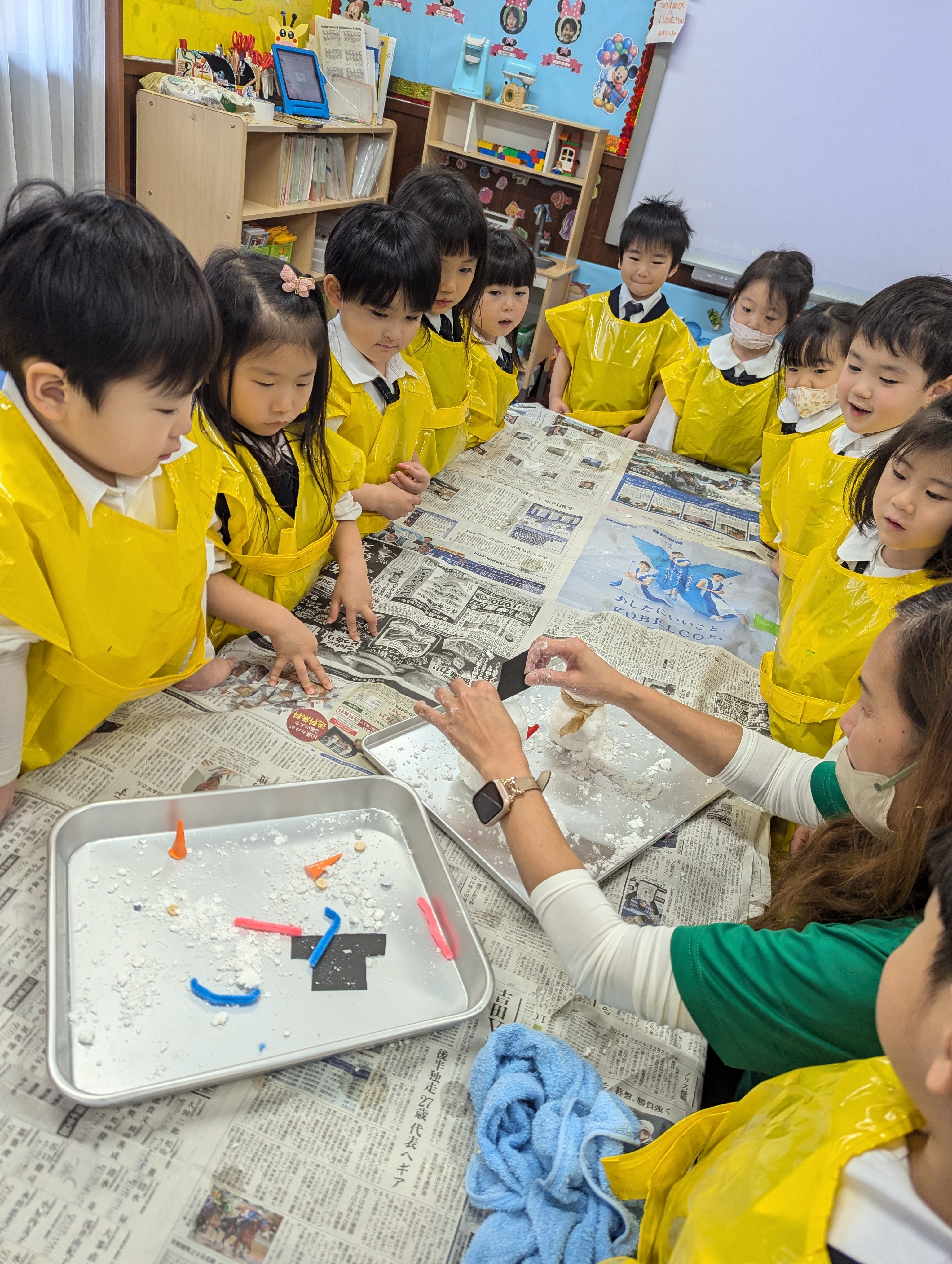 「どうして固まるの?」「本当に雪みたい!」と、子どもたちは興味津々で実験に参加していました。
