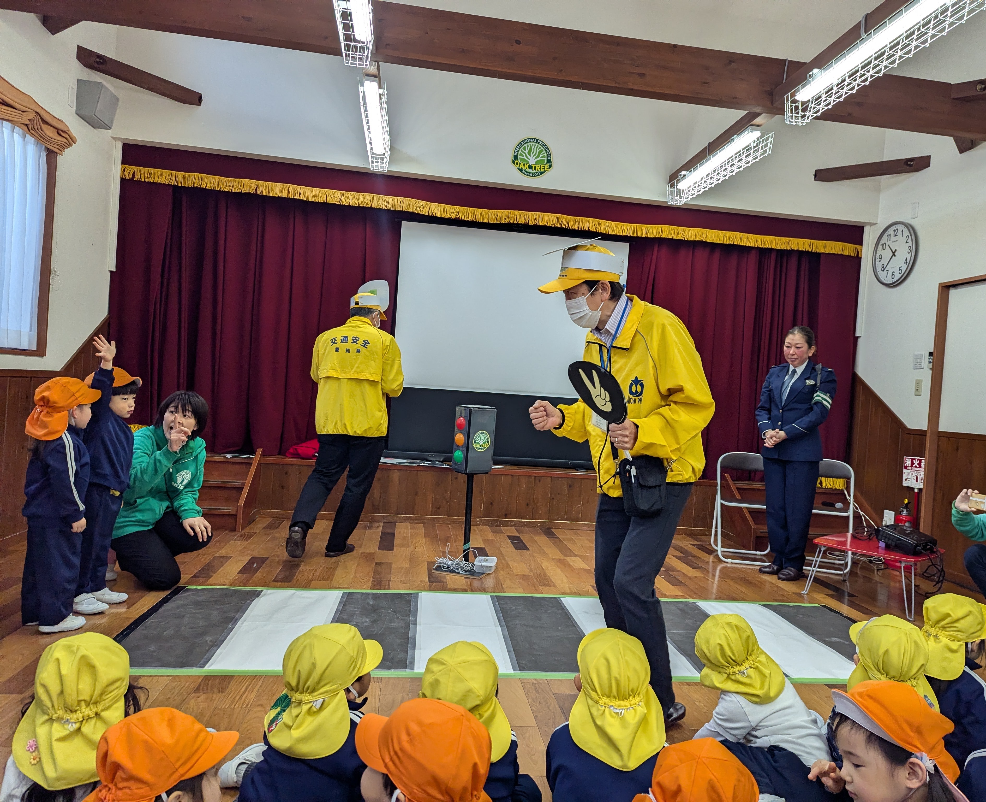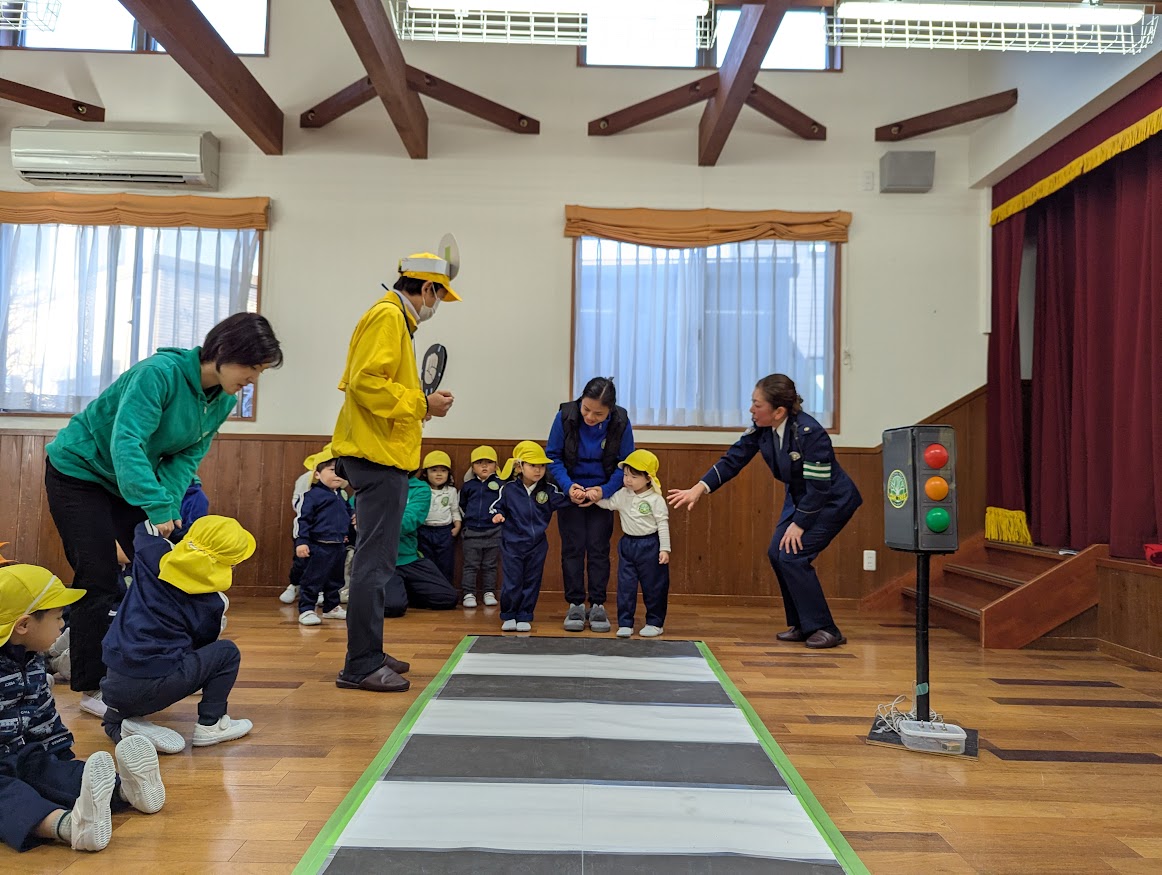 警察官の方からは、道路での約束や安全に行動するために大切なことを分かりやすくお話しいただき、子どもたちは真剣な表情で耳を傾けていました。