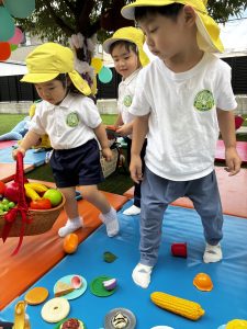 お弁当の後は、先生と一緒にRing-around-the-rosyやDuck Duck Gooseなどのゲームも楽しみ、笑い声が園庭いっぱいに響きました🎶
