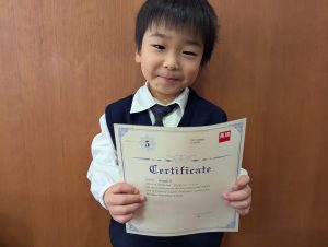 日々のレッスンの積み重ねの中で、アルファベットやフォニックス、簡単な会話表現を少しずつ身につけ、自信をもって試験に挑戦することができました。年少という年齢での挑戦は決して簡単なことではありませんが、楽しみながら英語に取り組んできた成果が実を結びました。