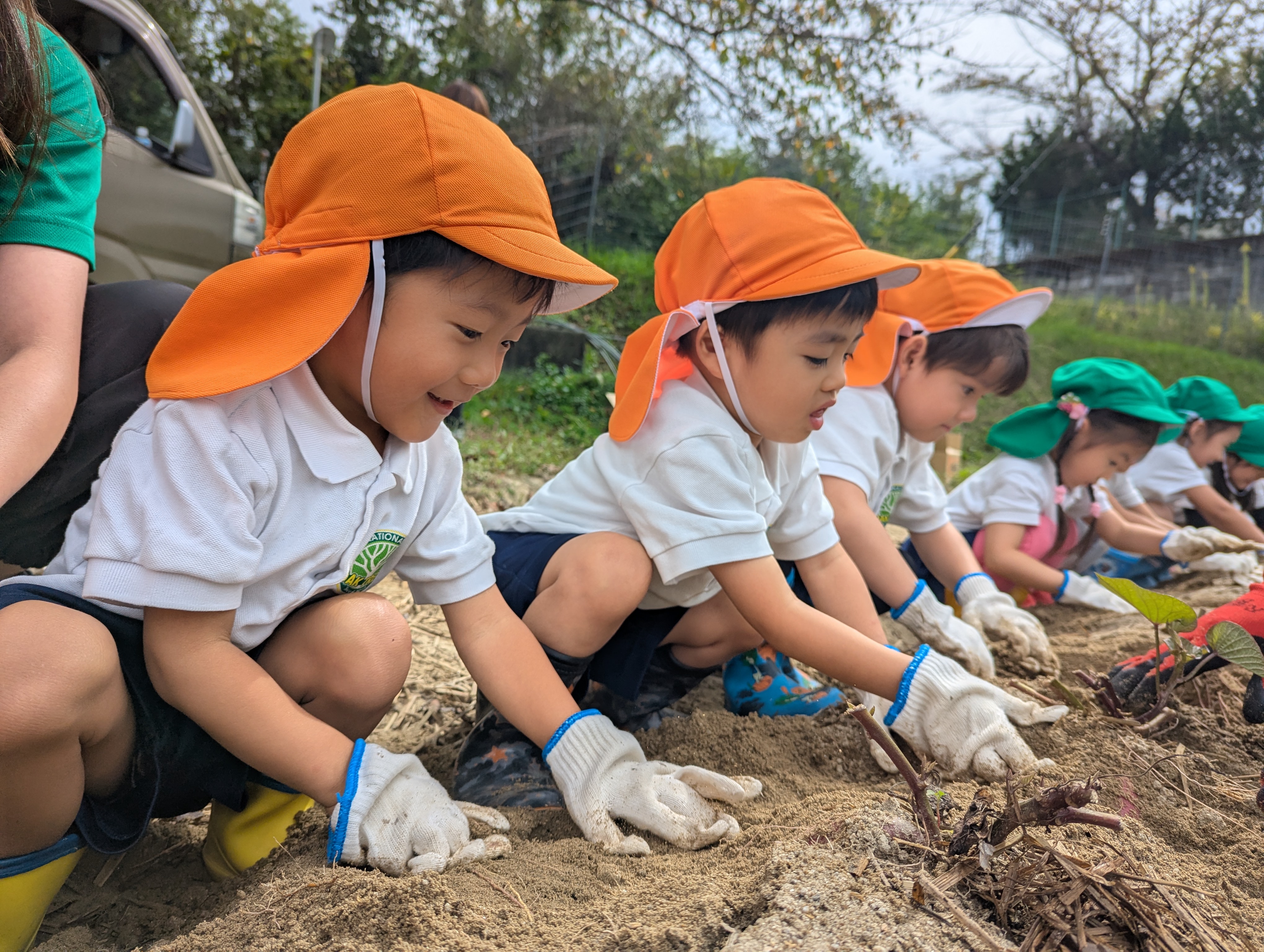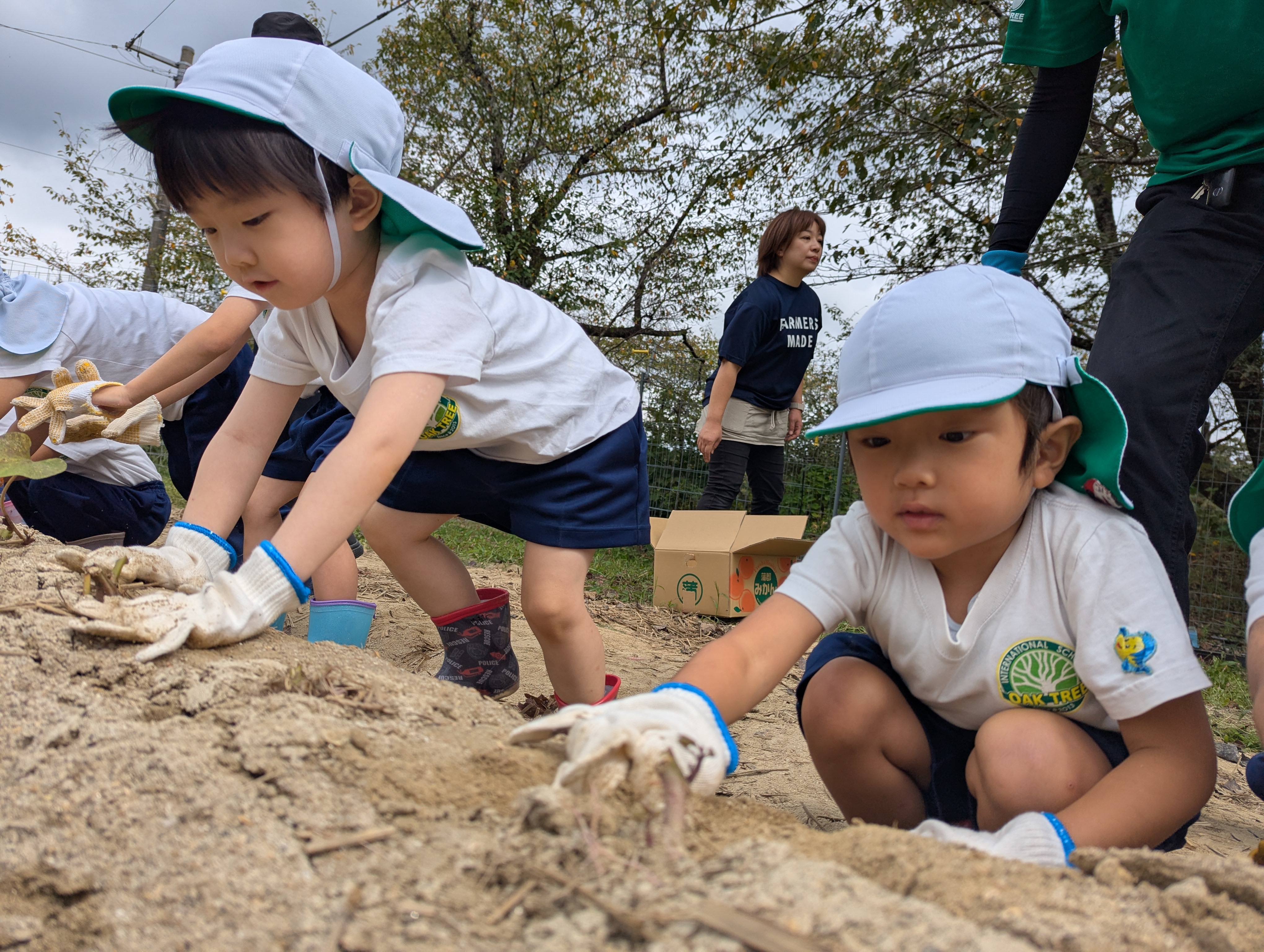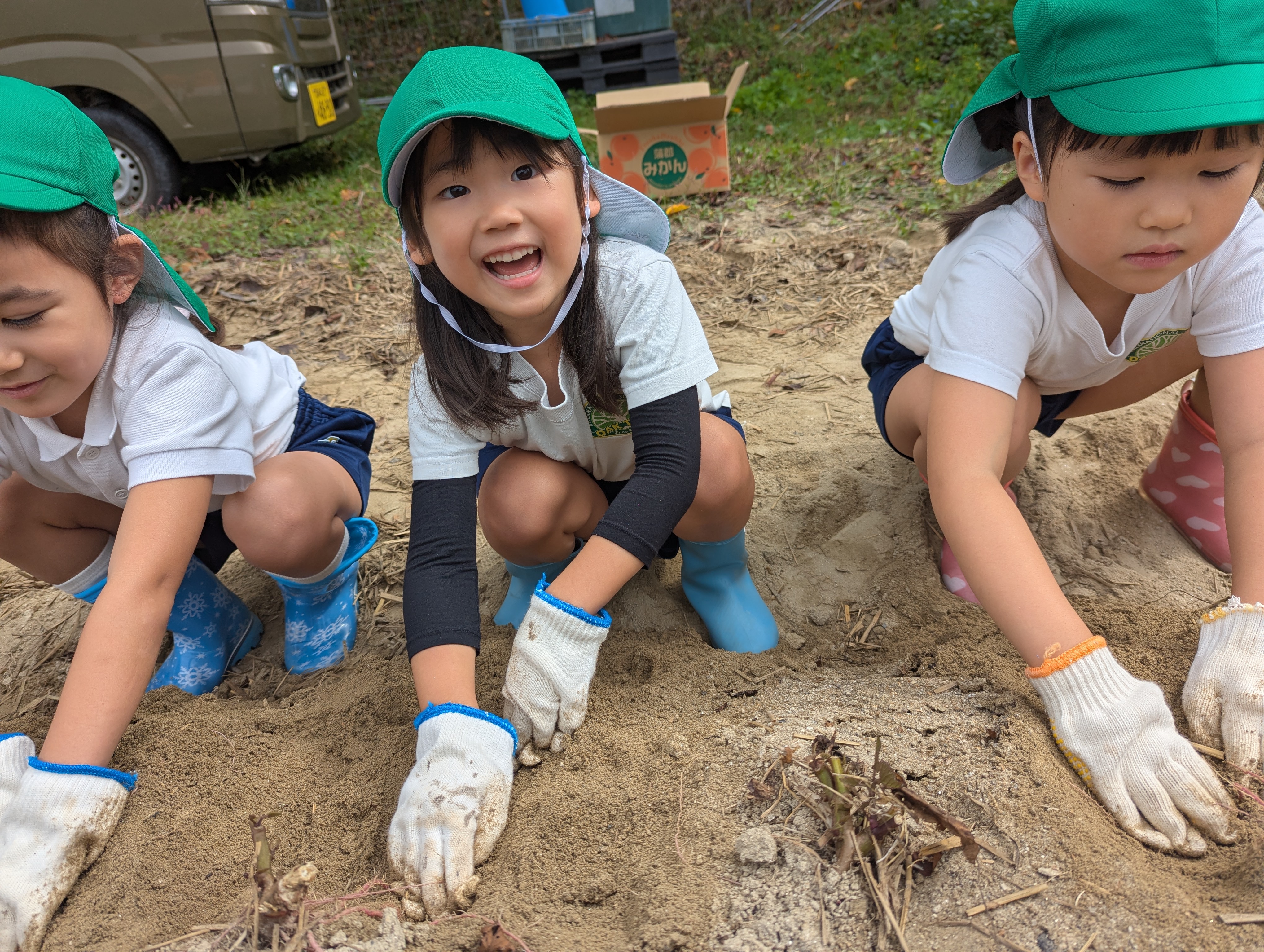 青空の下、子どもたちは土の感触を楽しみながら、一生懸命お芋を掘っていました。