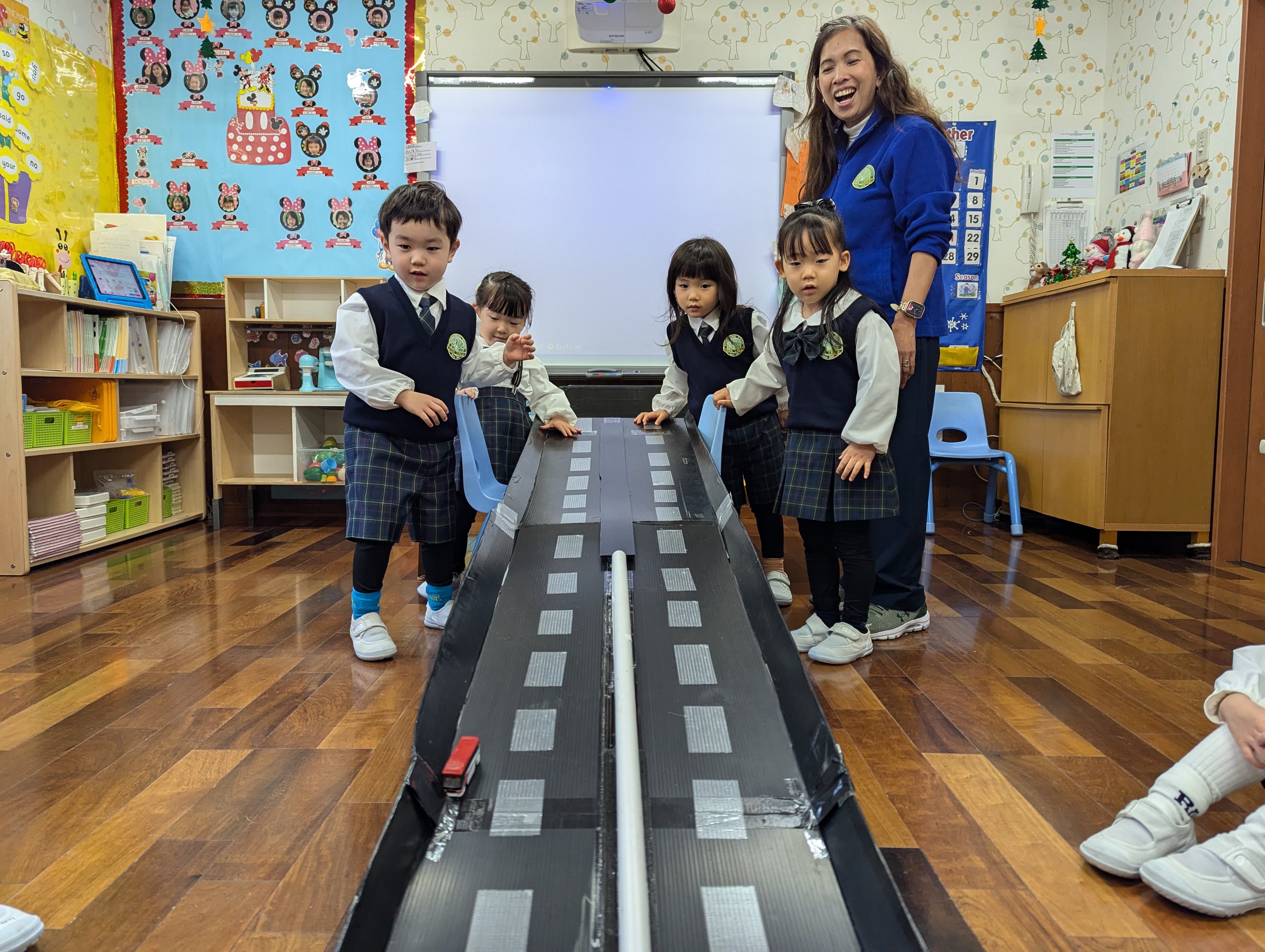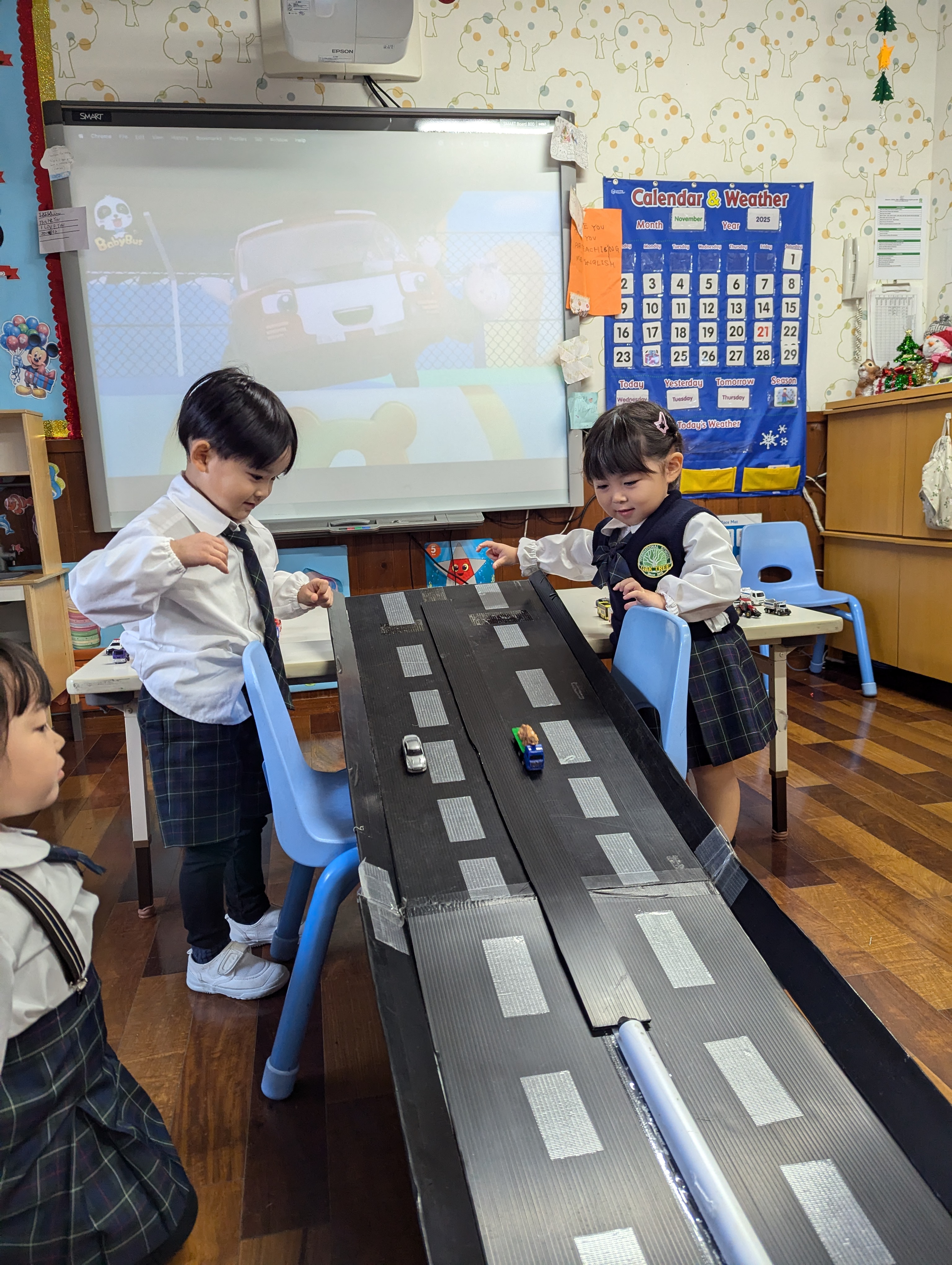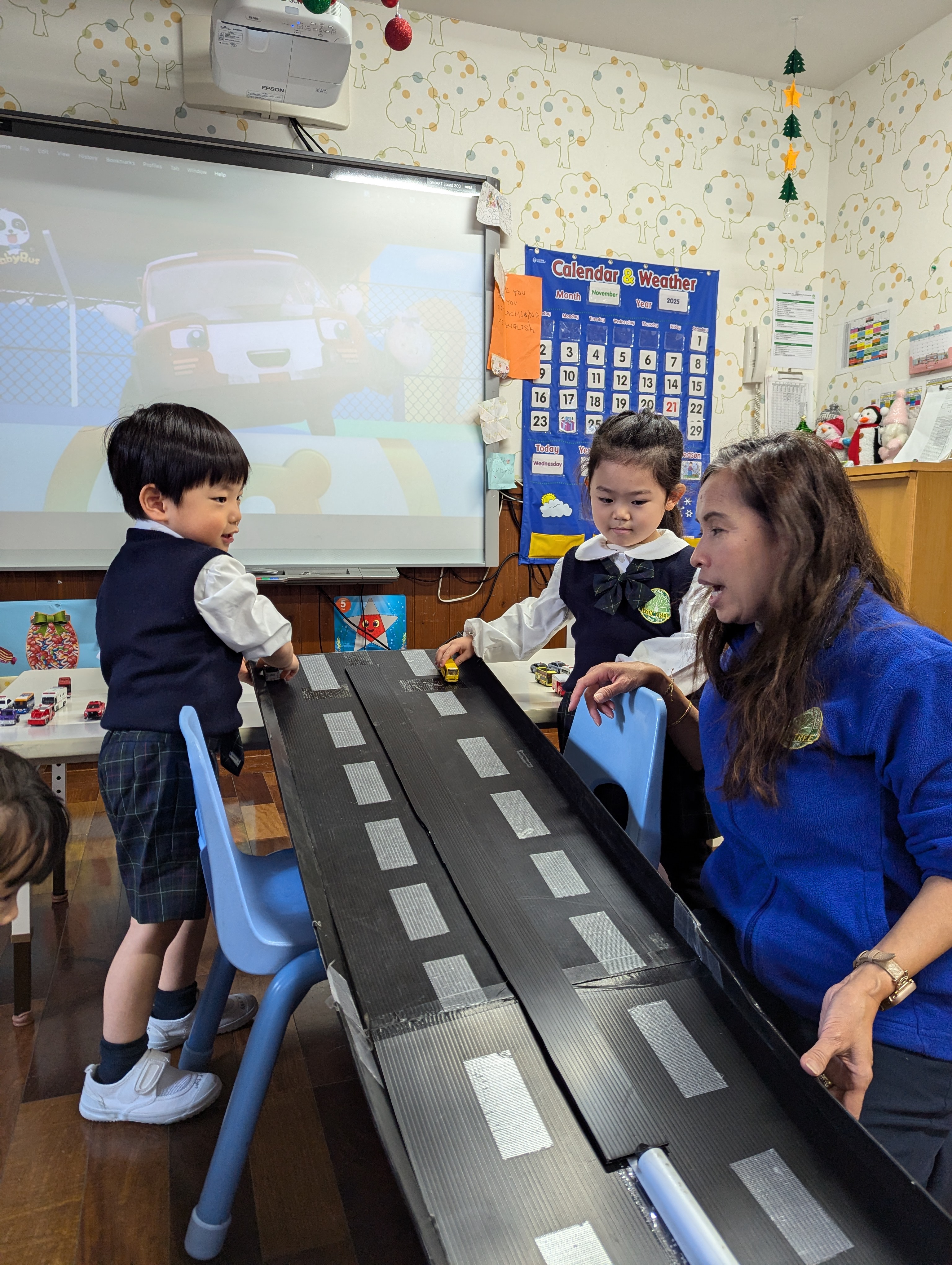 今日はサイエンスの時間に、いろいろな種類の車を使って「どの車が一番速く走るのか」をみんなで探りました。