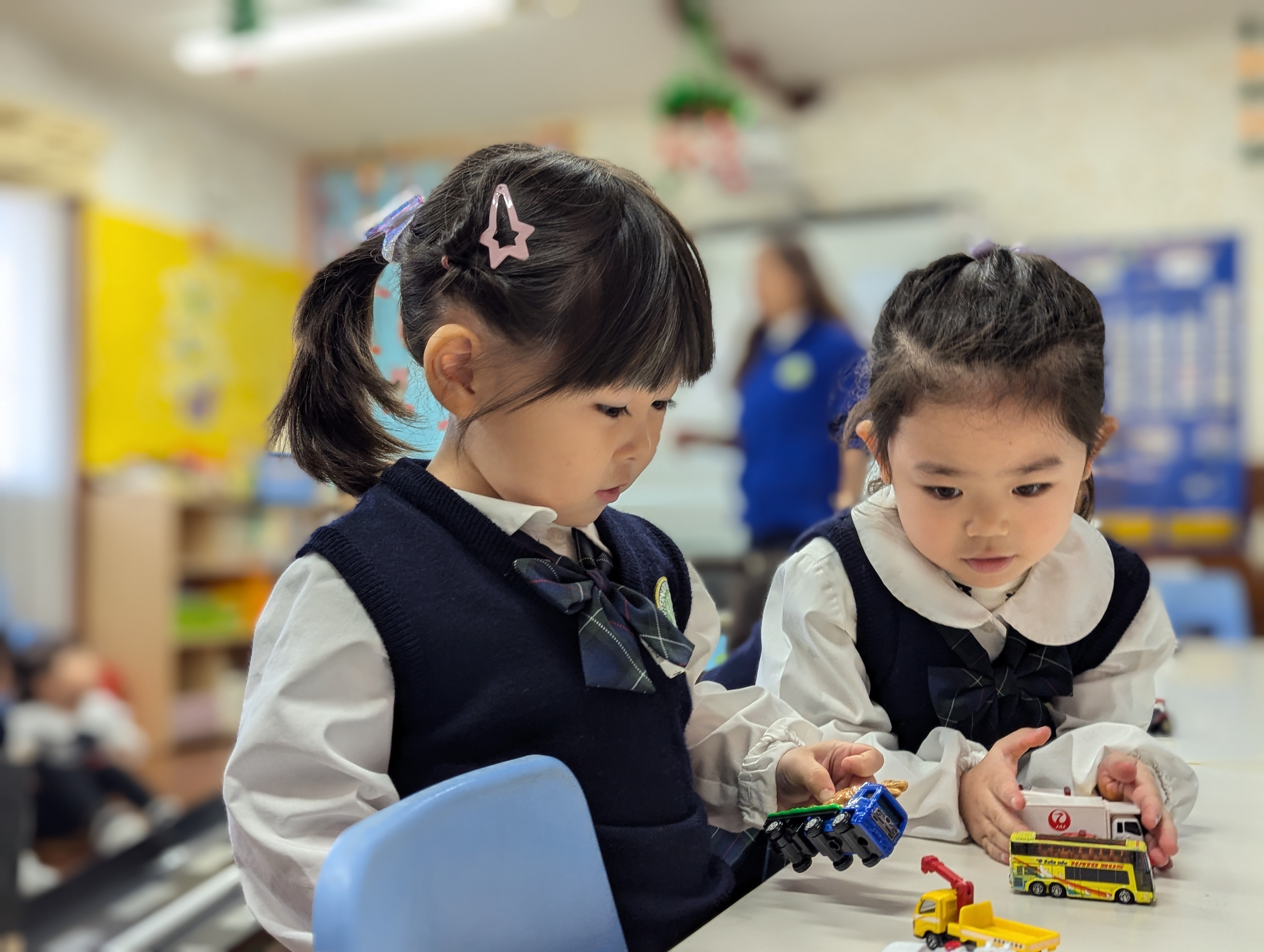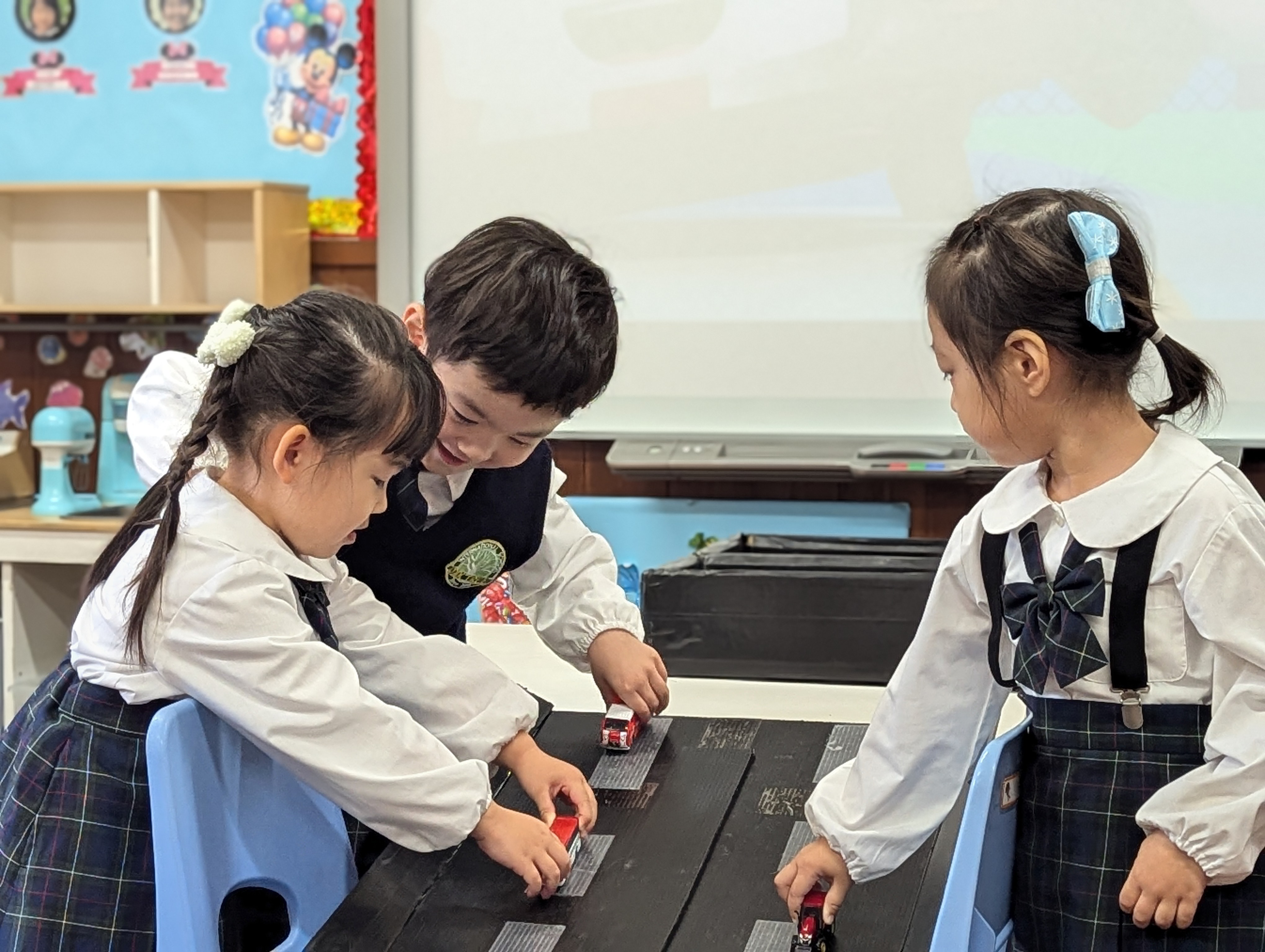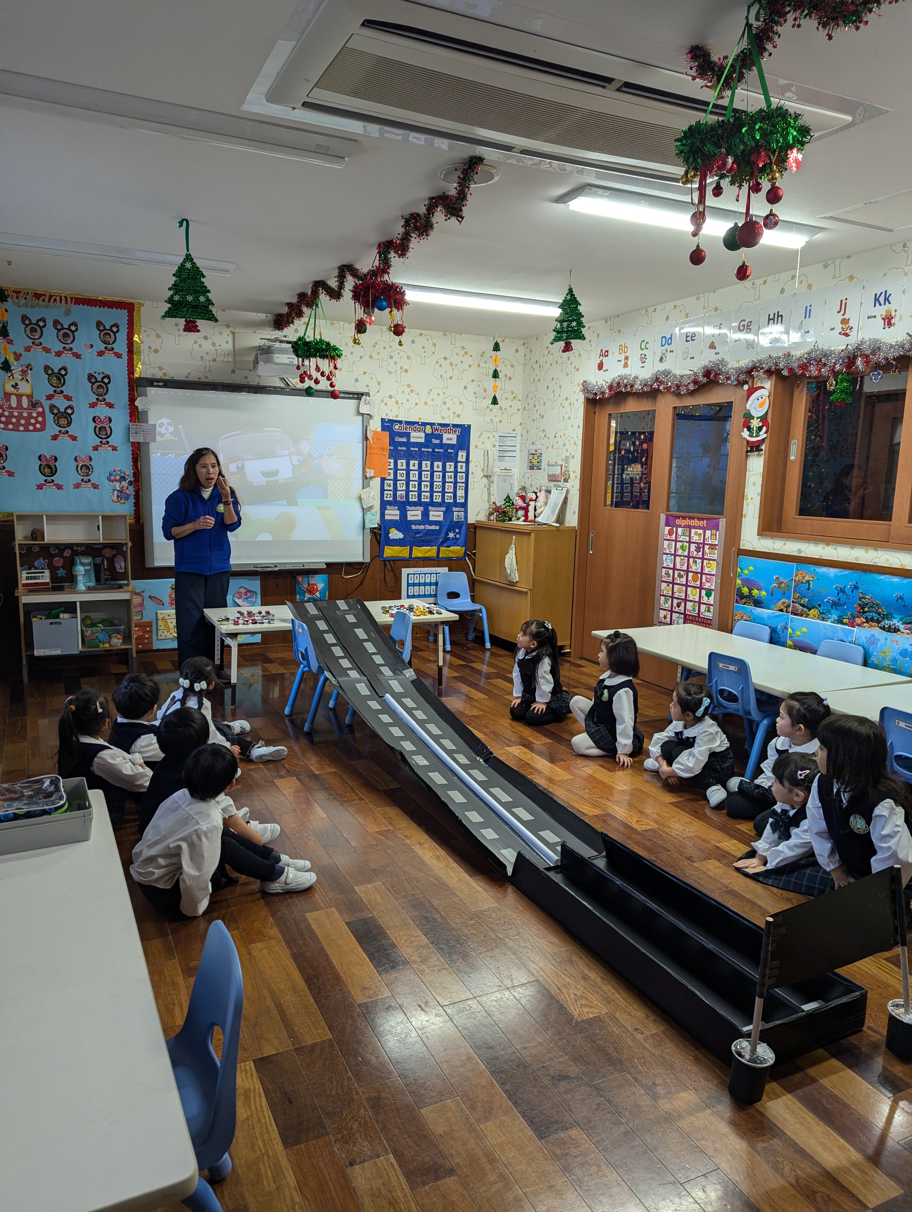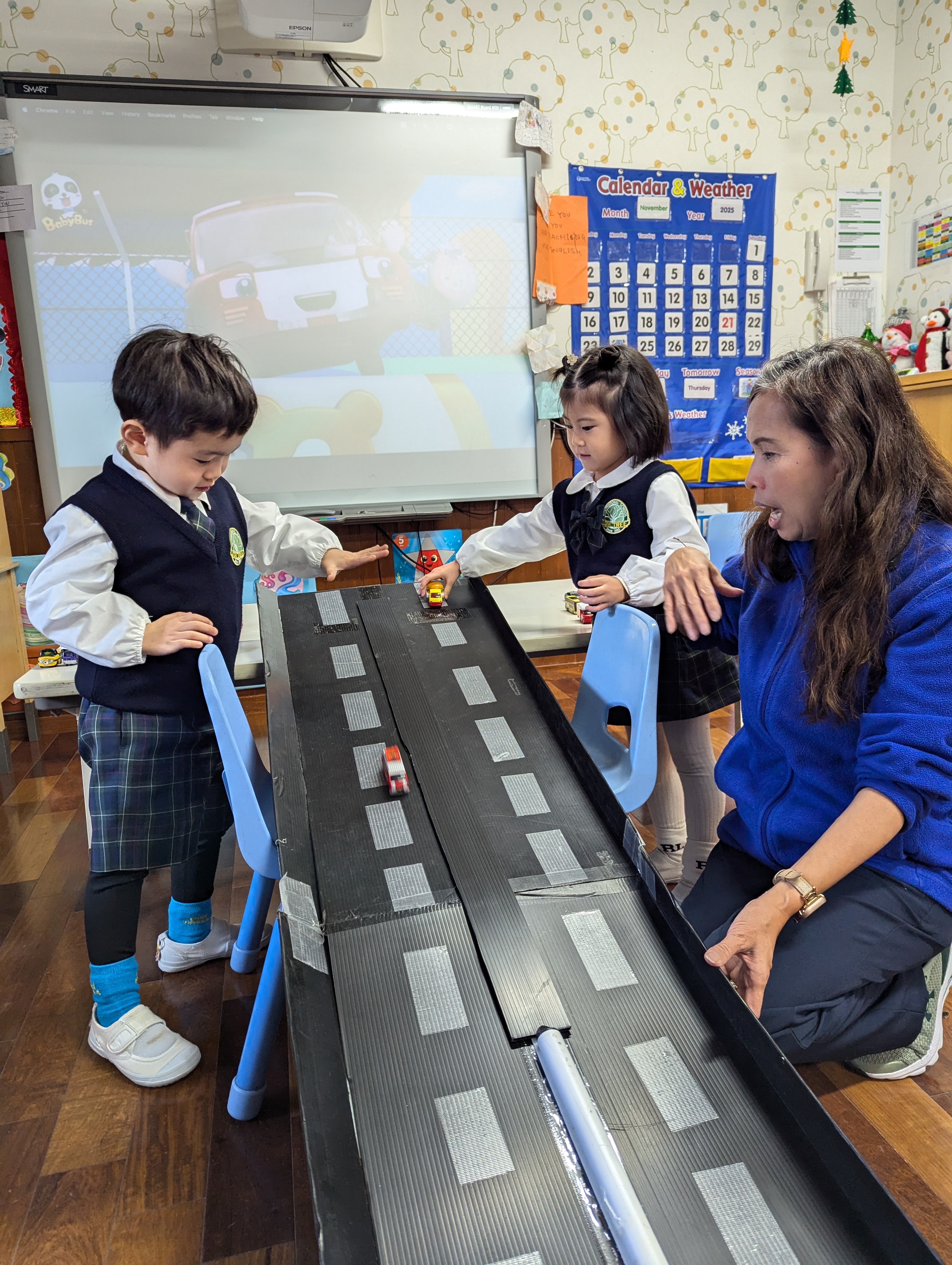 今日はサイエンスの時間に、いろいろな種類の車を使って「どの車が一番速く走るのか」をみんなで探りました。