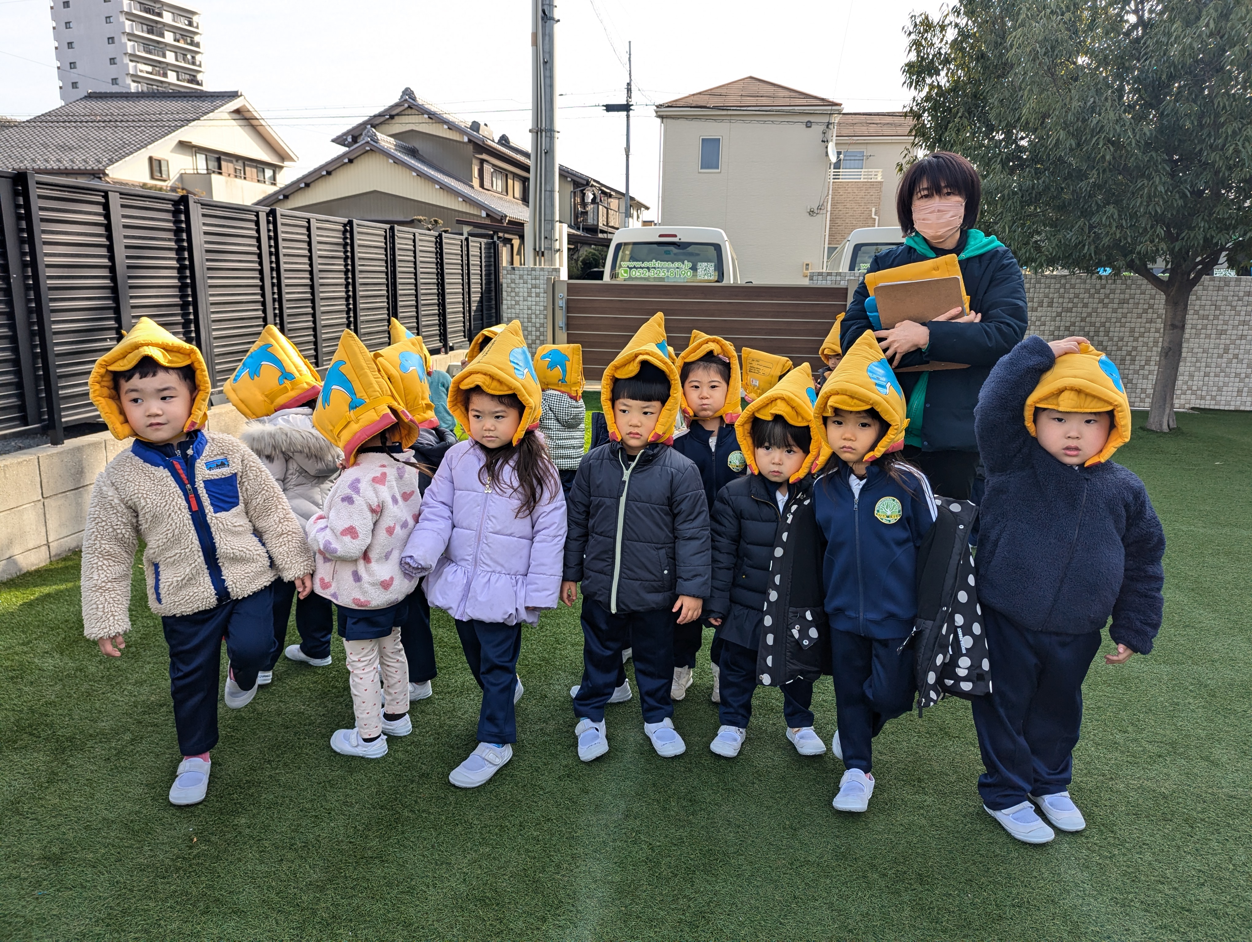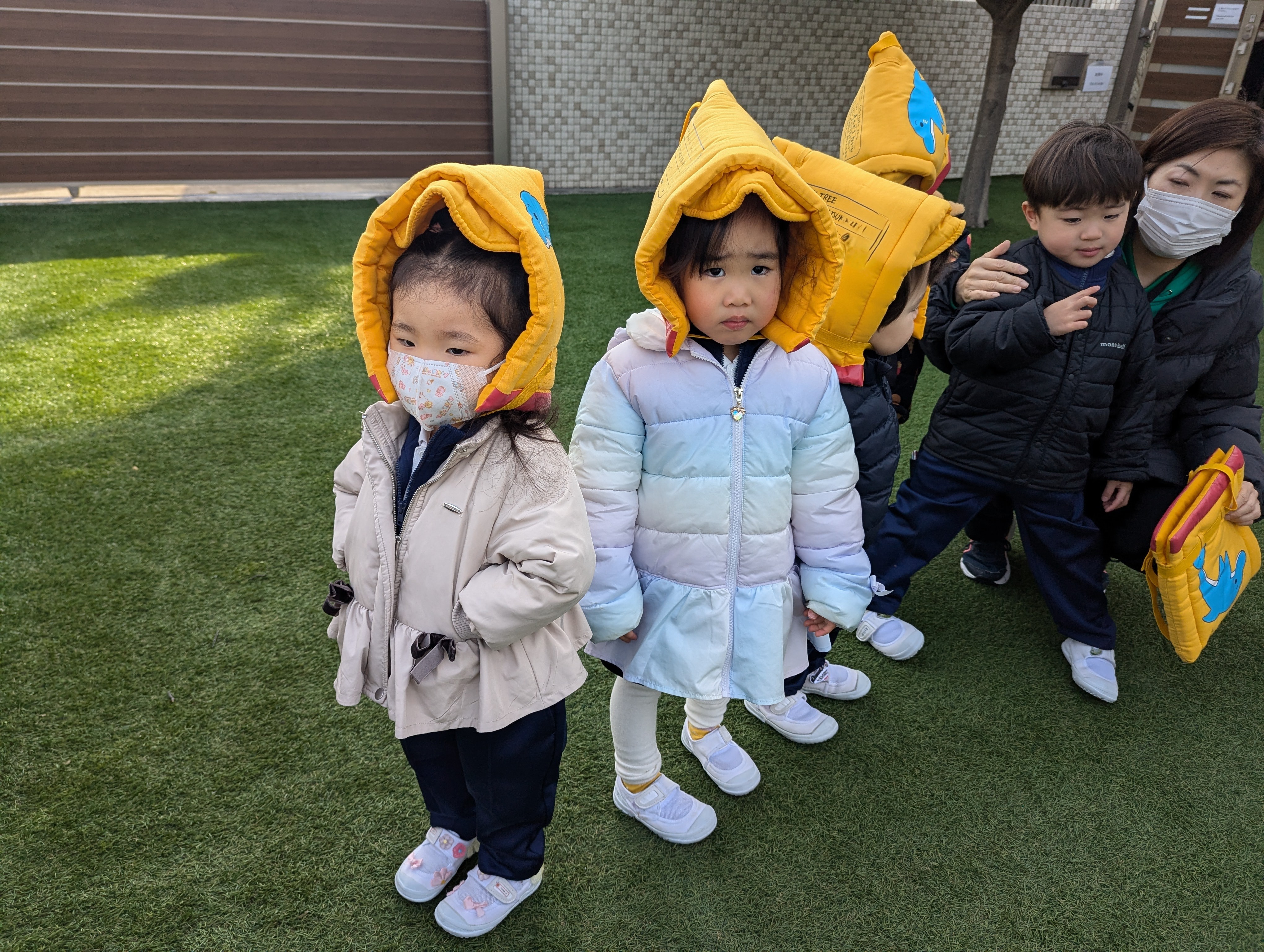 実際の災害時を想定し、子どもたちは先生の指示をよく聞きながら、落ち着いて行動する練習を行いました。