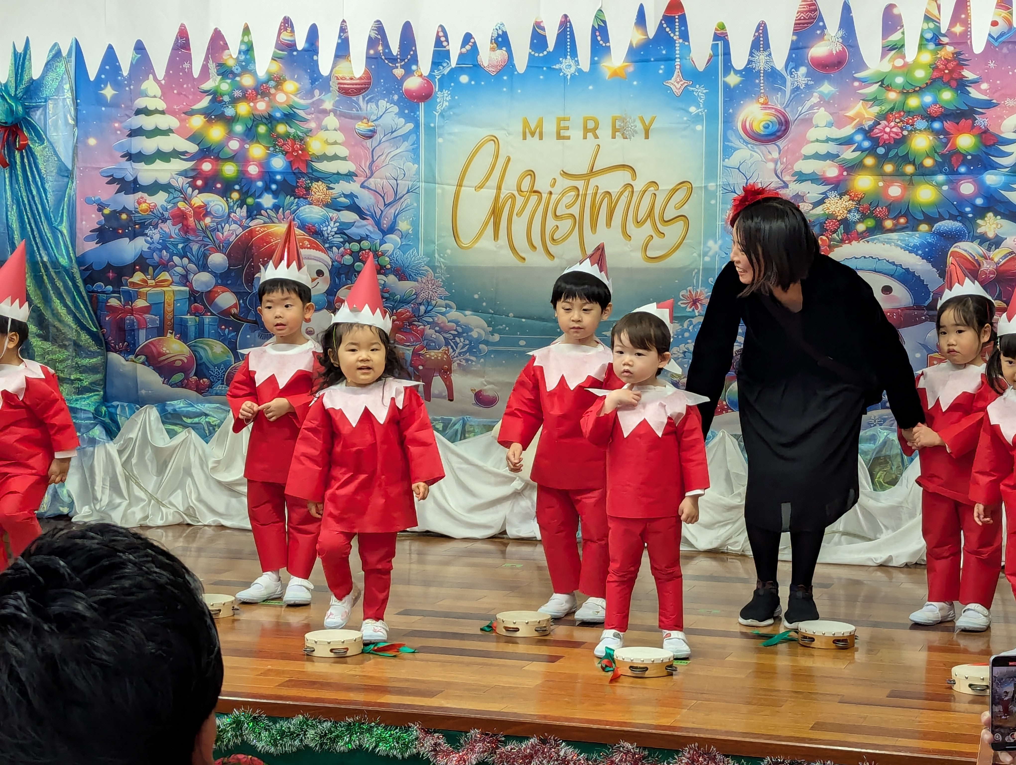 初めてのクリスマスパフォーマンスステージに少しドキドキしながらも、音楽が流れると自然と体を動かし、楽しそうに参加してくれました。