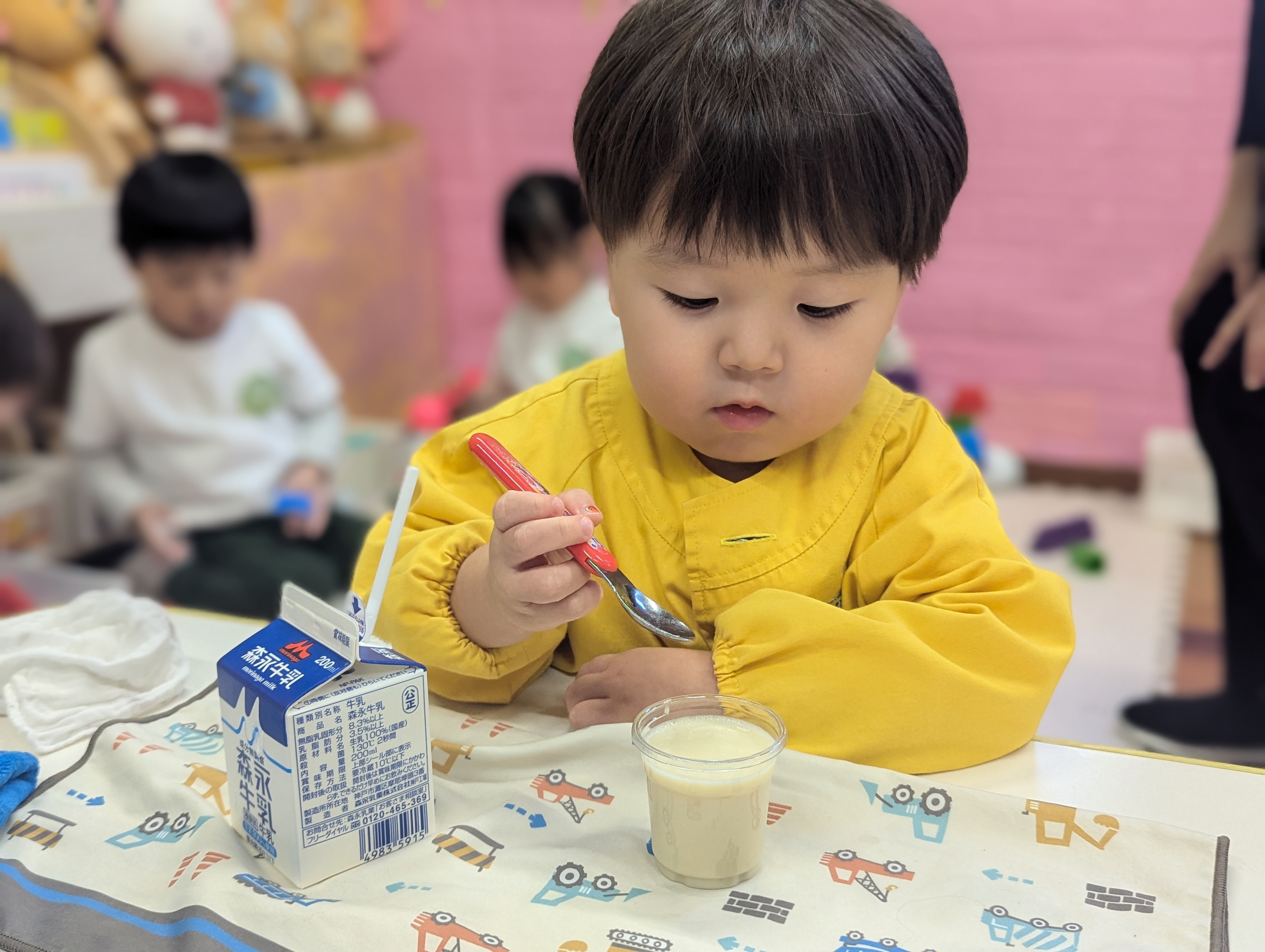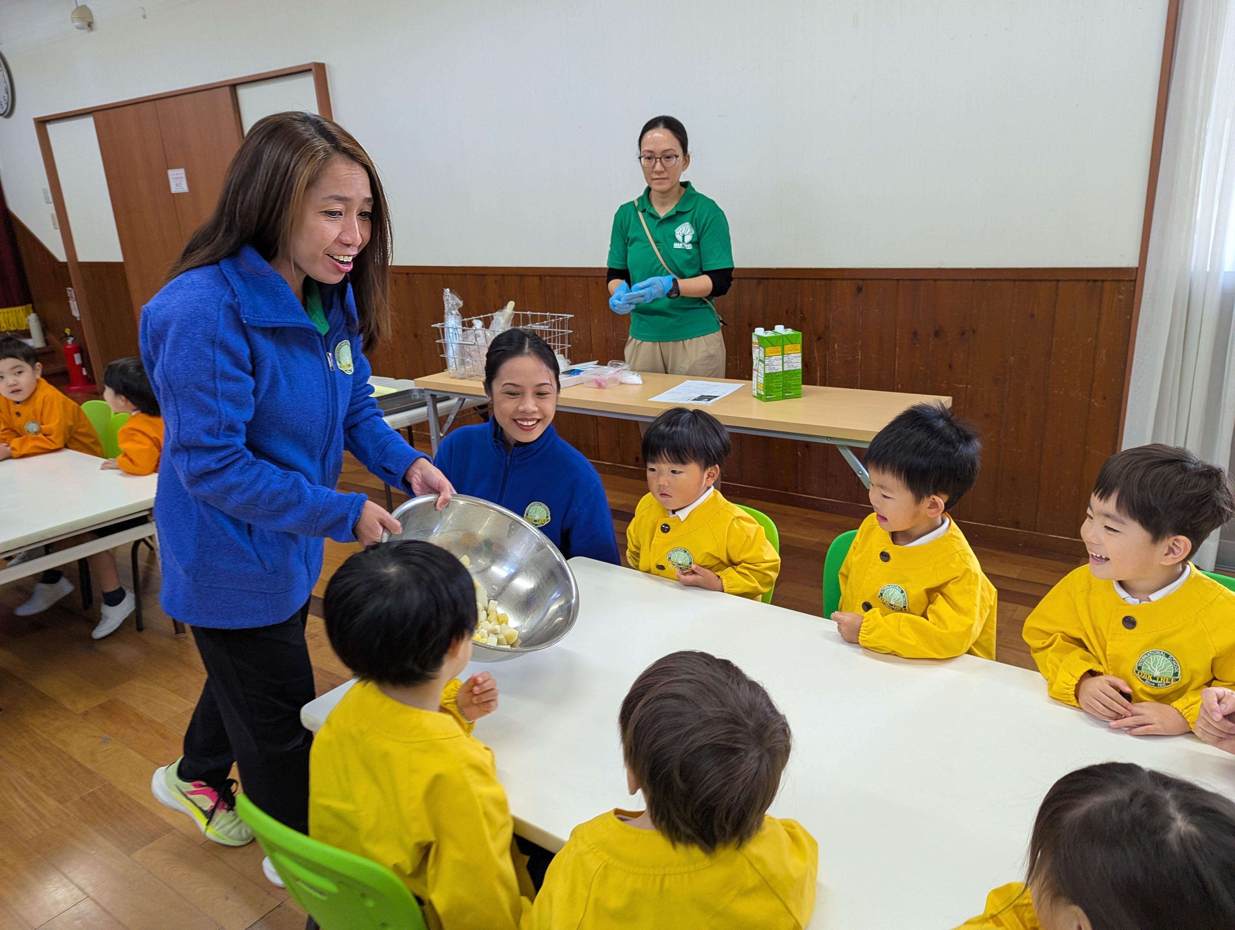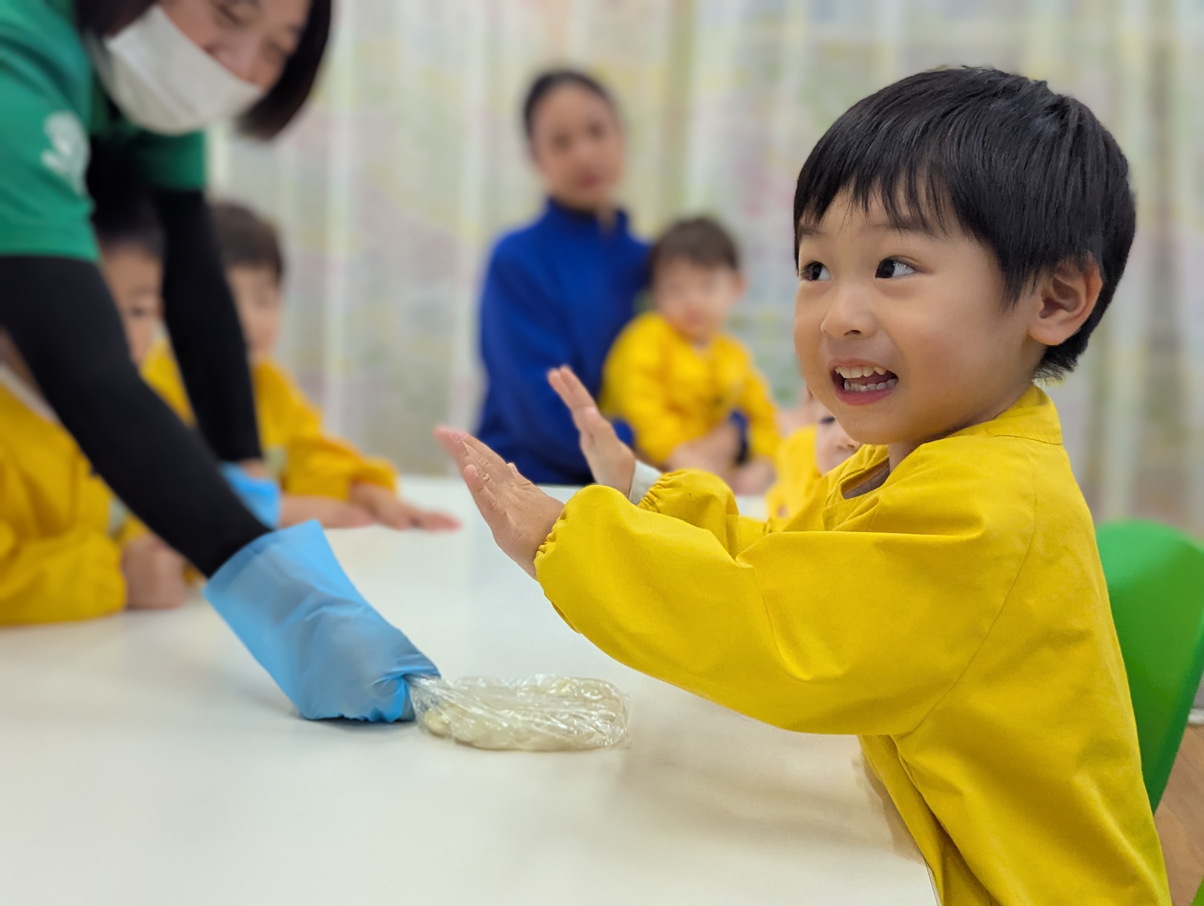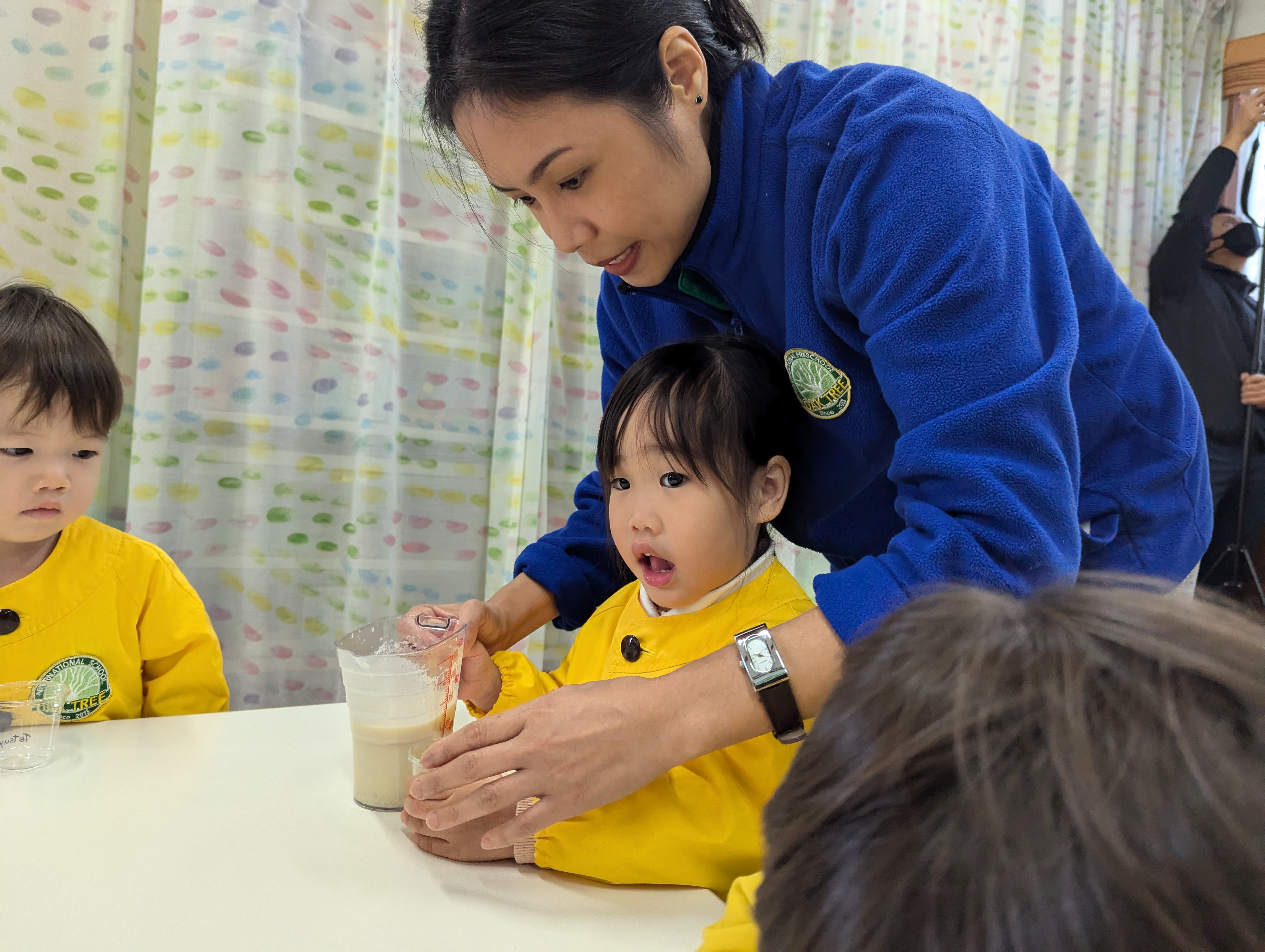 先生と一緒に材料を混ぜたり、カップに入れたりと、クッキングの雰囲気を存分に味わった子どもたち🎵